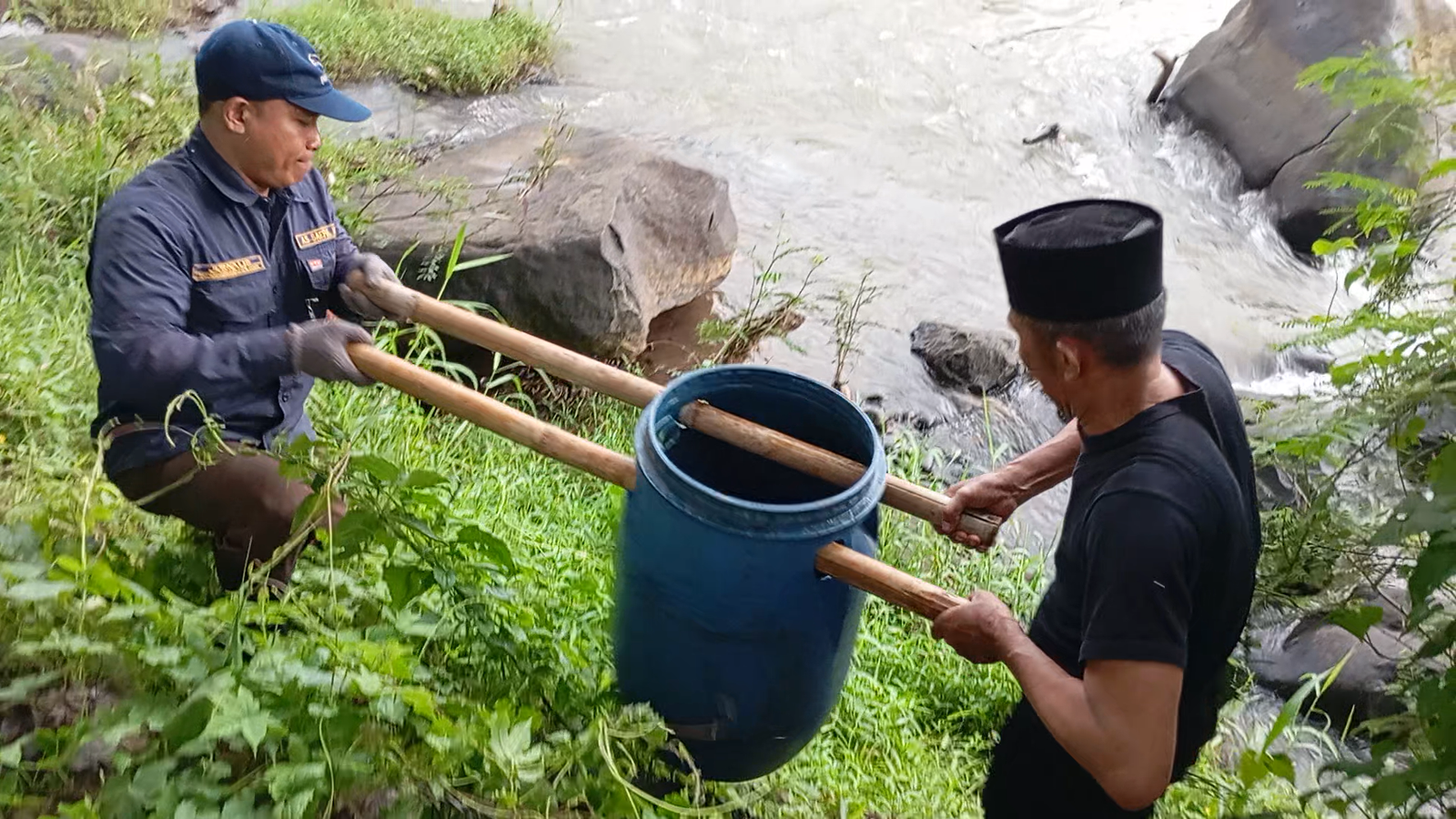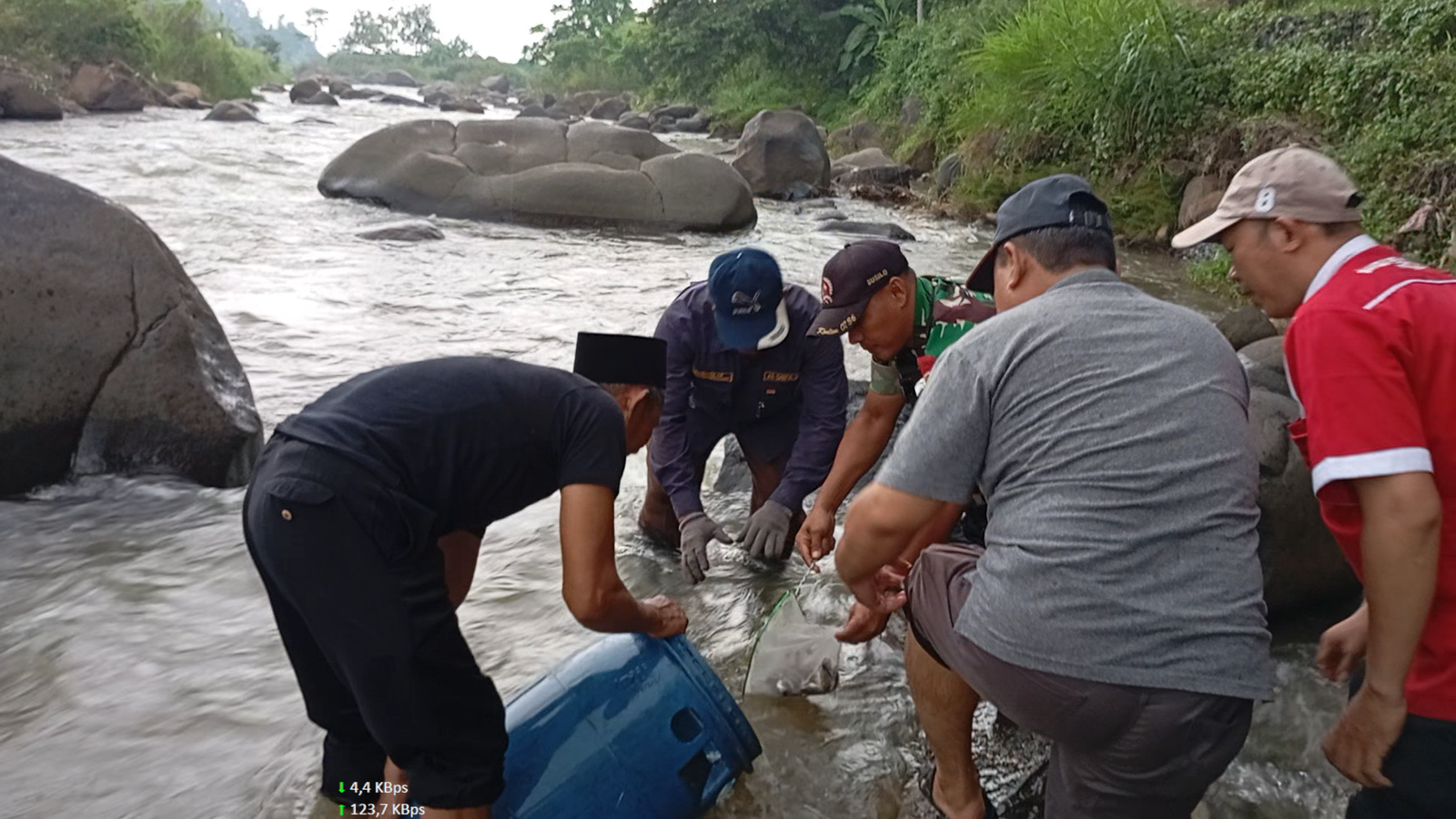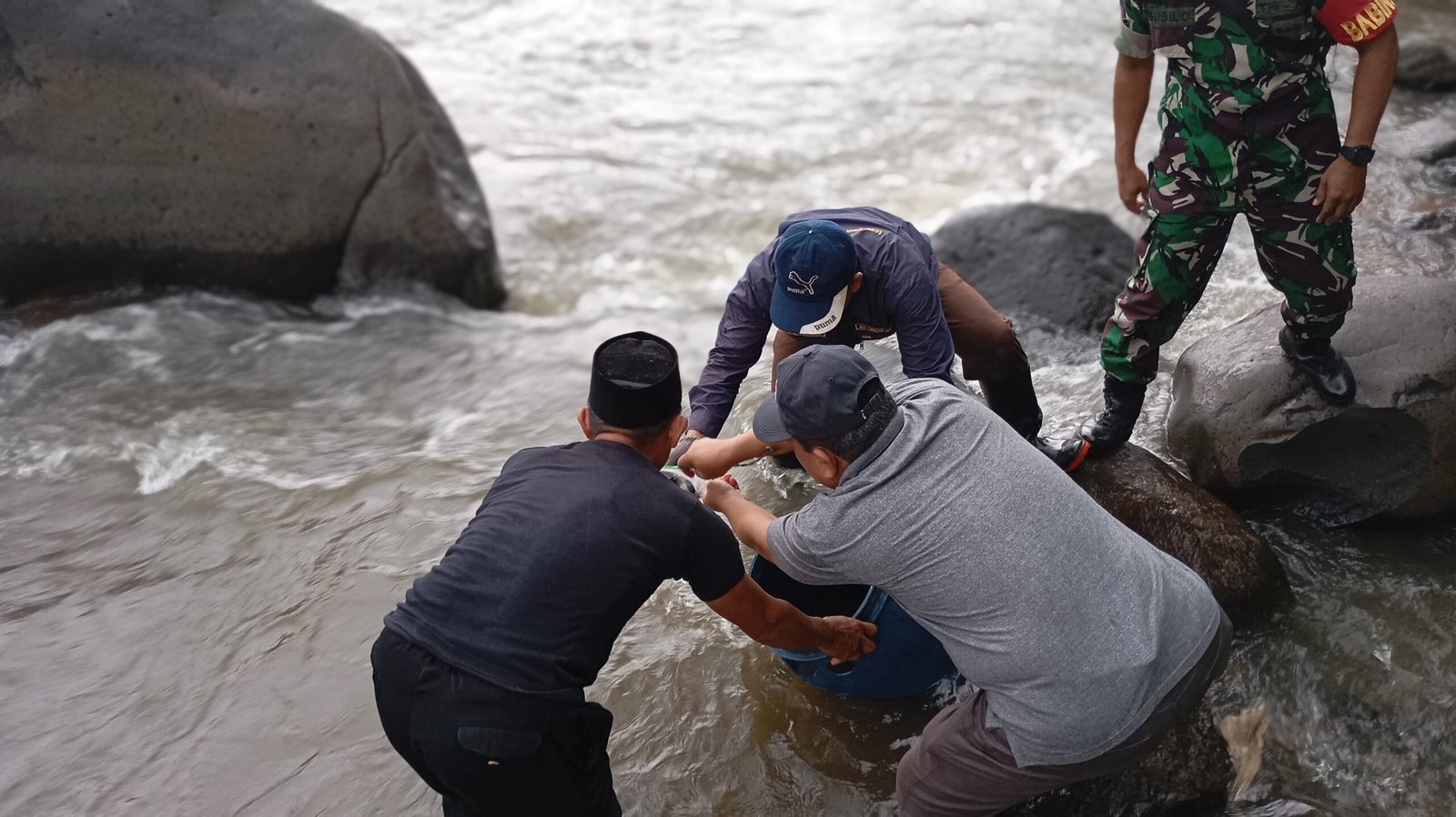 Tuntas penanaman pohon lanjut aksi lepas tebar ikan ke kali, walaupun hujan lumayan besar tapi para pegiat lingkungan ini tampak semangat, Pelepasan ikan dilakukan oleh Kepala desa Siberuk dan Sertu Susilo Babinsa desa setempat.