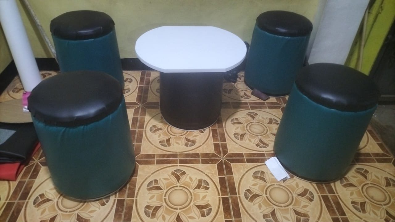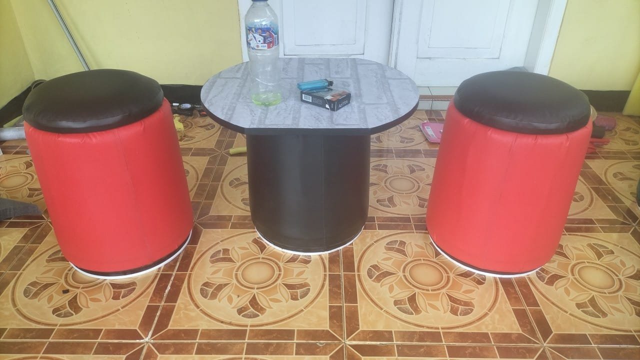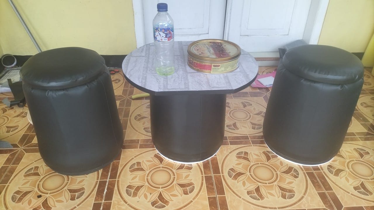Setelah semua bahan sudah siap, baru kemudian merakit ember bekas cat tersebut menjadi meja dan kursi. Untuk kenyamanan dan keindahan jangan lupa tambahkan bantalan yang terbuat dari busa dan kain mengelilingi kursi.