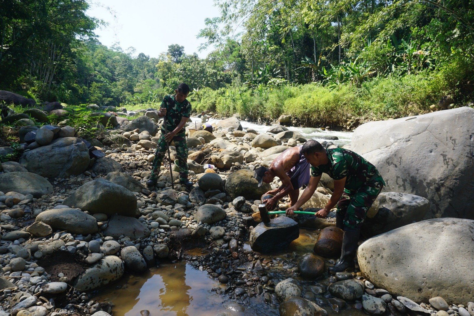 TERASPANTURANEWS.COM– Batang Babinsa Koramil 07/bandar Kodim 0736/Batang bersama warga setempat terus percepat pembangunan jembatan gantung dengan memcahkan material batu sungai untuk bahan cor dasar pondasi jembatan gantung Garuda di desa Tambahrejo kecamatan Bandar Kabupaten Batang, Selasa (21/04/2026)