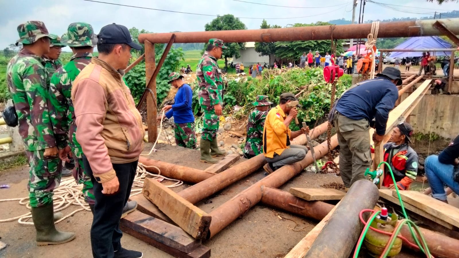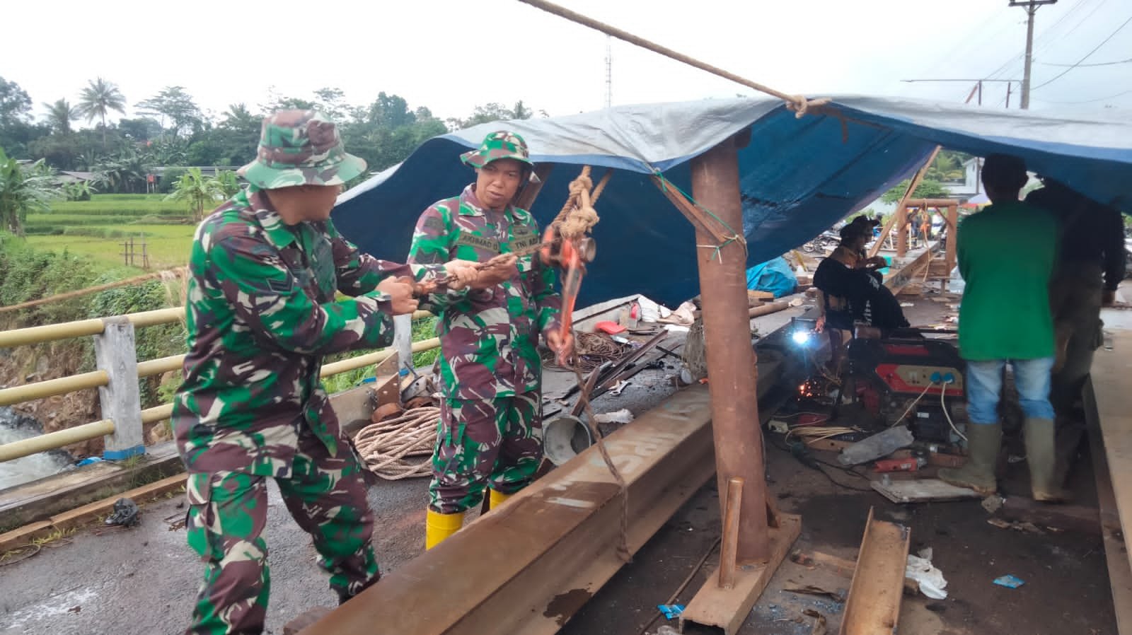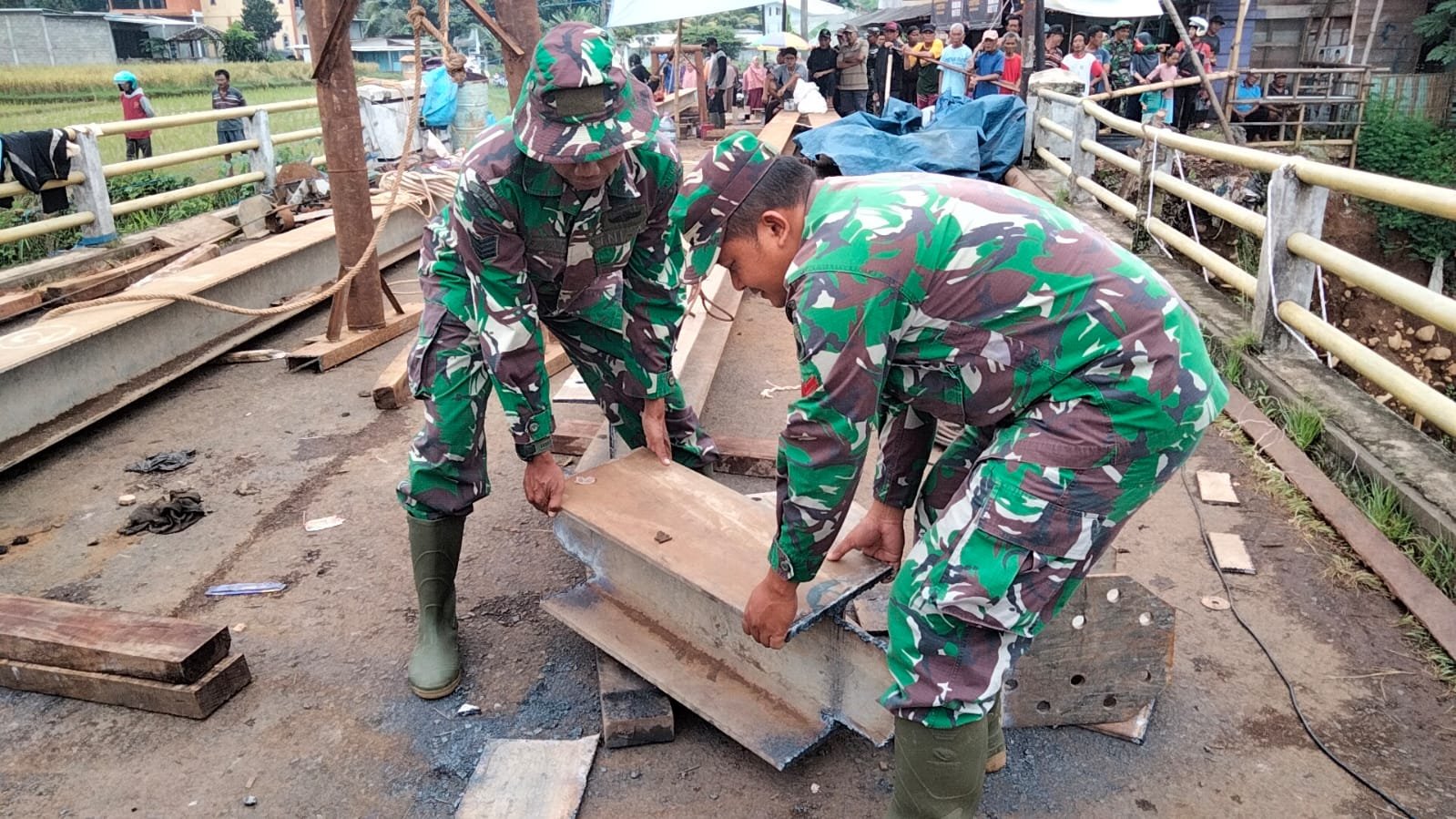 Babinsa Koramil 06/Tersono Bantu Perbaiki Jembatan Kalibelo Yang Rusak Akibat Banjir Bandang