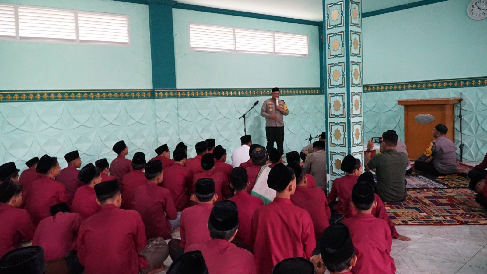 BATANG – Kapolres Batang AKBP Nur Cahyo Ari Prasetyo mengajak para santri Pondok Pesantren Al Inaaroh untuk memperkuat persatuan dan kesatuan sesuai falsafah Bhinneka Tunggal Ika. Ajakan ini disampaikan saat melaksanakan salat Ashar berjamaah dan memberikan pesan kamtibmas di pesantren tersebut pada Senin, 9 September 2024.
