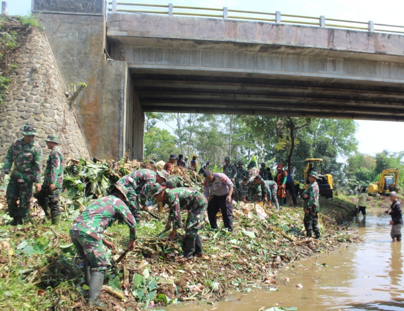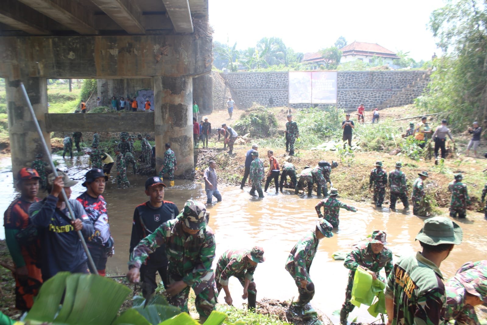 Meskipun mengalami hambatan tepat di bawah jembatan, di mana terdapat banyak pohon pisang bahkan pohon nangka yang tumbuh diatas sendimen nyaris menutup aliran sungai dan alat berat tidak mampu untuk merobohkan, namun hambatan tersebut berhasil diatasi melalui tenaga manual.