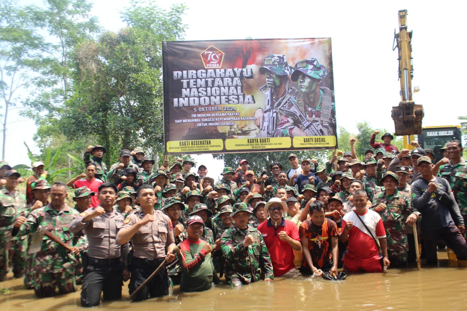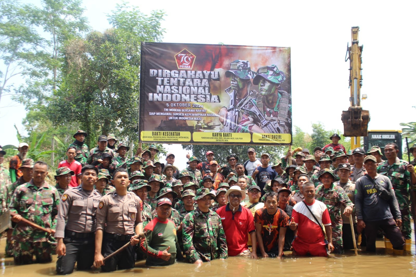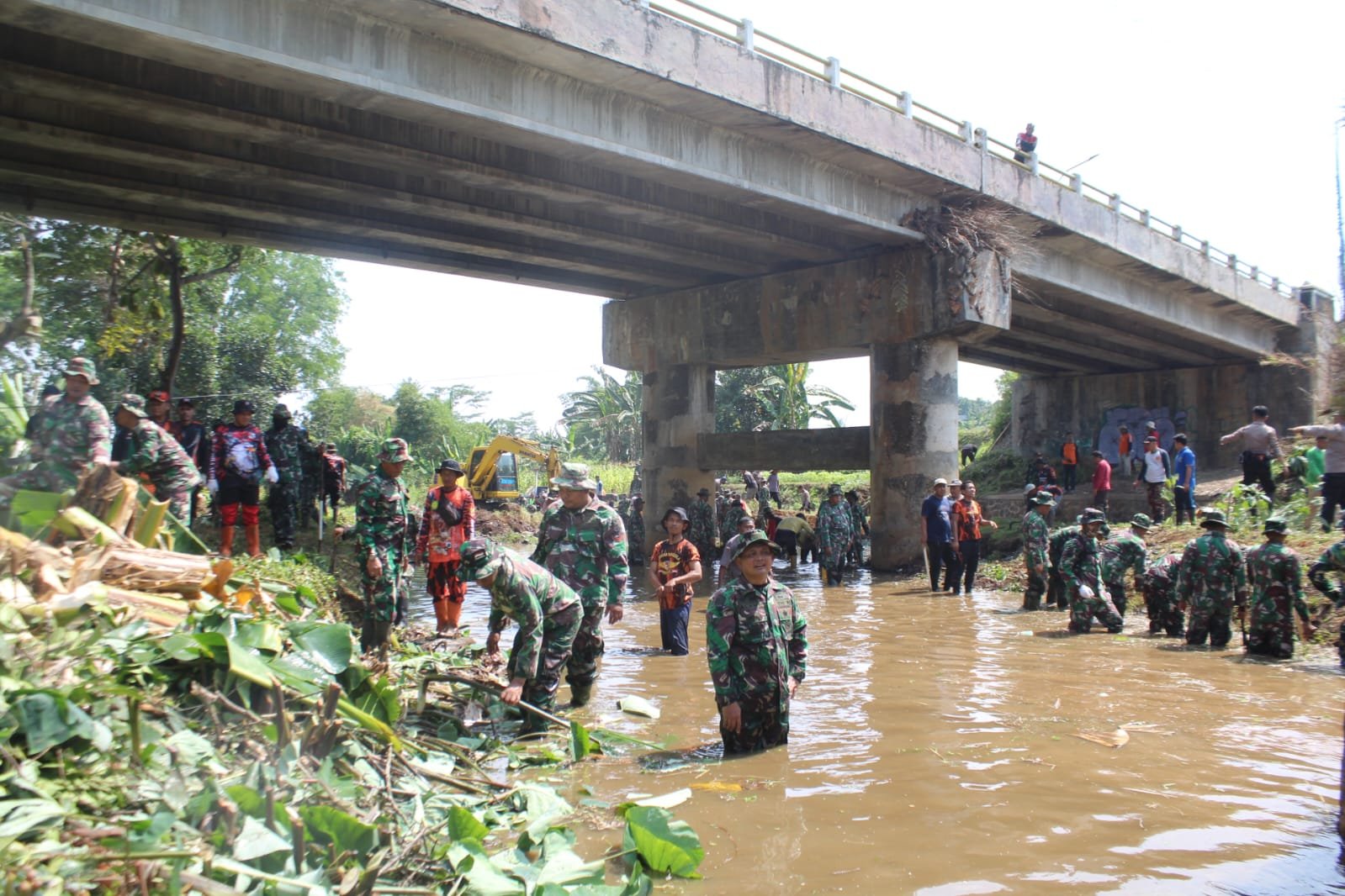 Batang,- Sungai Mlangi merupakan salah satu sungai yang sangat penting untuk pengairan area persawahan warga khususnya wilayah Desa Tersono, Kranggan dan Desa Tanjungsari. Saat ini aliran sungai Mlangi tersumbat dan mengalami pendangkalan yang disebabkan karena sampah yang menumpuk dan tumbuhnya rumput disekitaran aliran sungai. Tampak terlihat Ratusan prajurit dari Kodim 0736/Batang bersama dengan berbagai organisasi masyarakat bekerja keras membersihkan aliran sungai Mlangi yang mengalami pendangkalan dengan mengerahkan 3 alat berat excavator. Kamis (26/09/2024).
