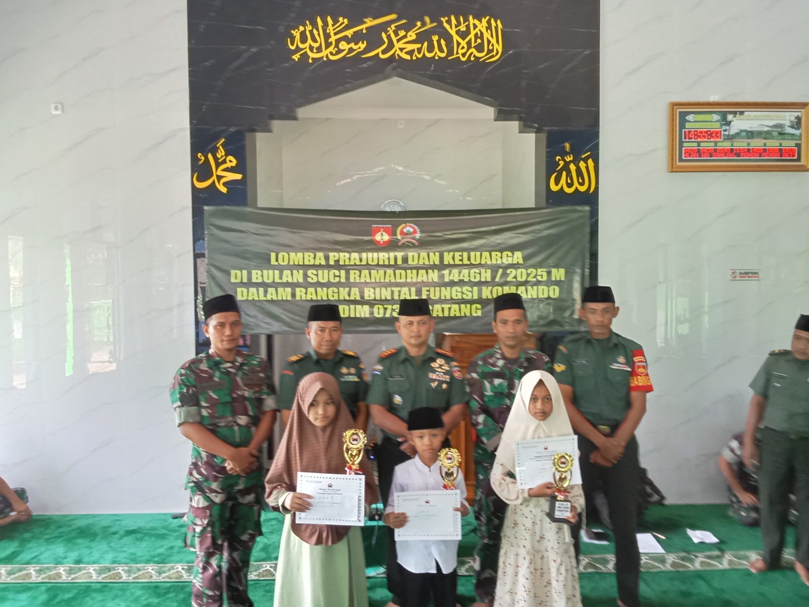 Batang,– Dandim 0736/Batang, Letkol Inf. Ahmad Alam Budiman., S.E., M.I.Pol., M.Han., menyerahkan Piala, Sertifikat serta uang pembinaan kepada pemenang Lomba Ceramah, Baca Al Qur’an, Menghafal Surat Pendek Al Qur’an dan Lomba Adzan dalam rangka menyambut hari raya idul Fitri 1446 H di wilayah Kodim 0736/Batang bertempat di Masjid Baiturrahman Desa Tragung Kecamatan Kandeman Kabupaten Batang. Jum’at (14/3/2025).
