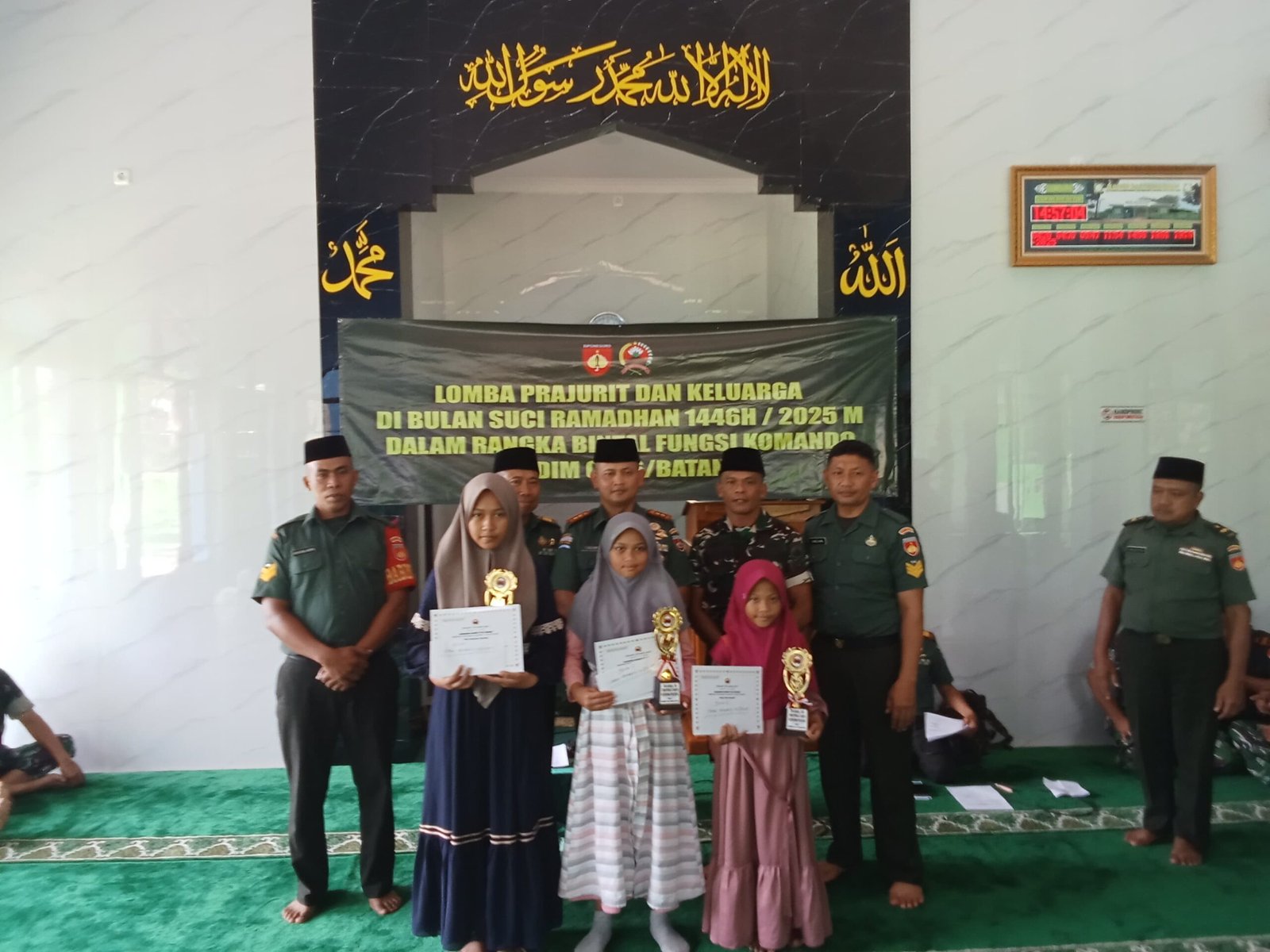 Untuk anak Prajurit telah diadakan selama 2 hari dimulai Kamis kemarin, diantaranya Lomba Adzan, Lomba Baca Al Qur’an, Lomba Ceramah dan Lomba Hafalan Surat Pendek Al Qur’an. Dan hari ini lomba dinyatakan resmi ditutup oleh Dandim 0736/Batang disertai dengan pembagian piala serta uang pembinaan kepada para pemenang.