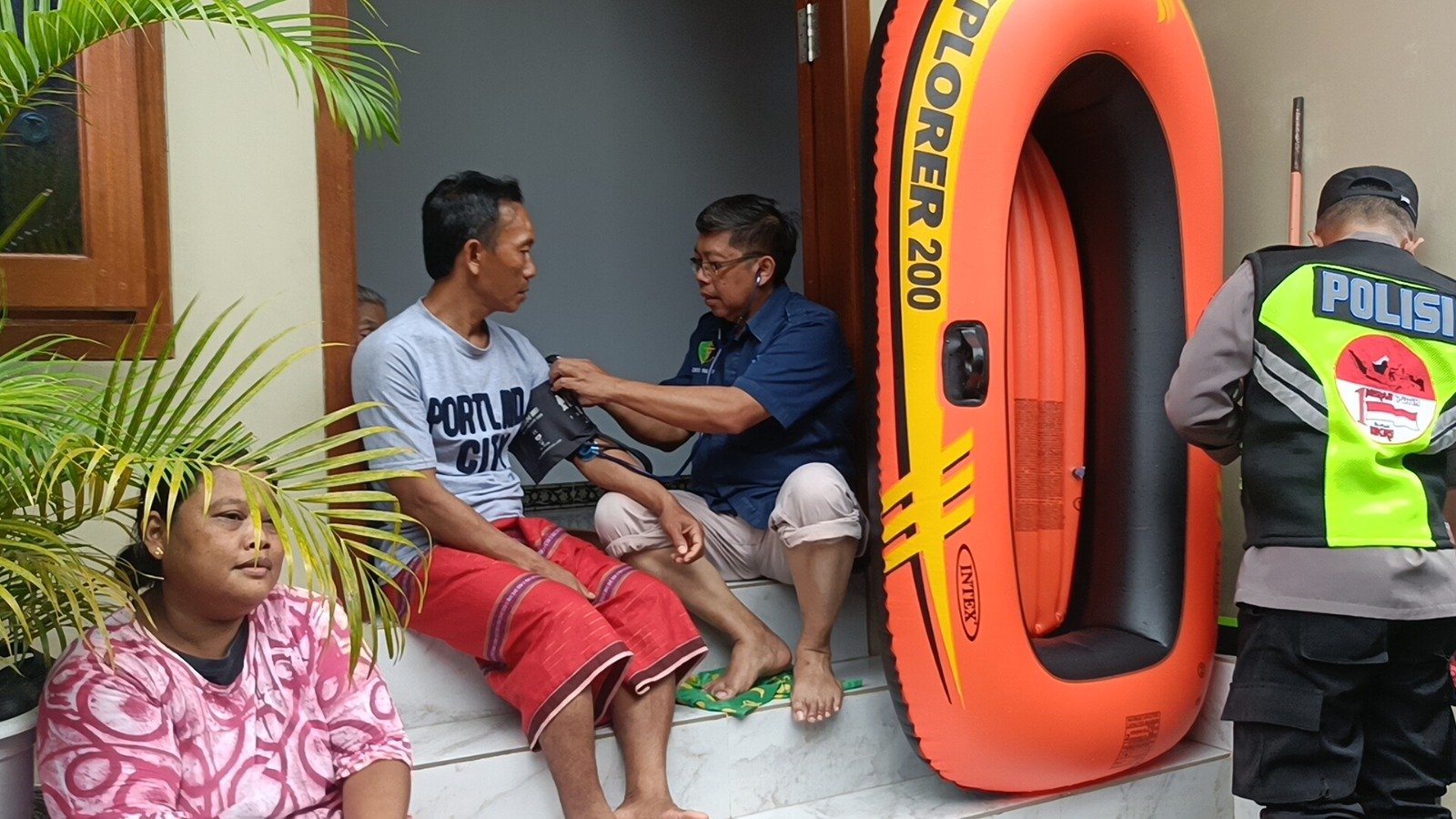 Sejumlah warga mendapat pemeriksaan kesehatan di tengah genangan banjir langsung oleh Kasi Dokkes Polres Batang Cipto Waluyo bersama tim hingga memberikan obat sesuai keluhan yang dirasakan. Ia bersama petugas kesehatan sengaja terjun langsung mengecek kesehatan warga terdampak, untuk memastikan kondisinya tetap baik, meski terdampak banjir.