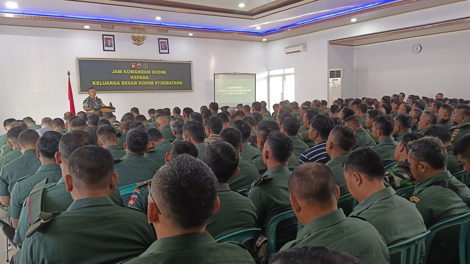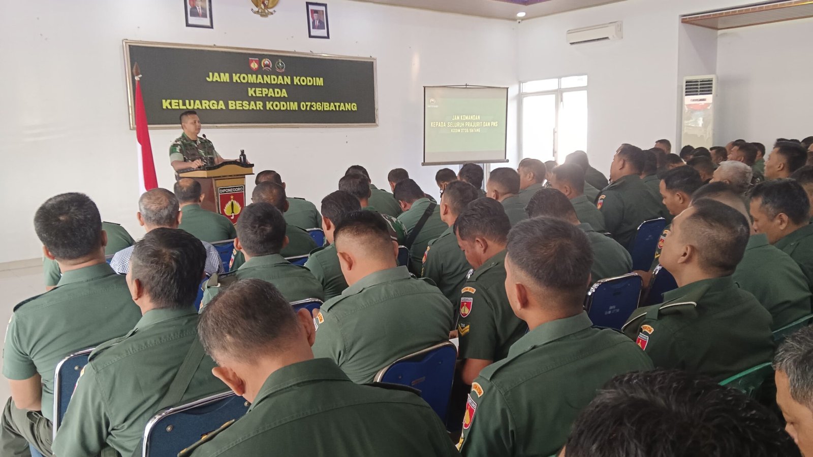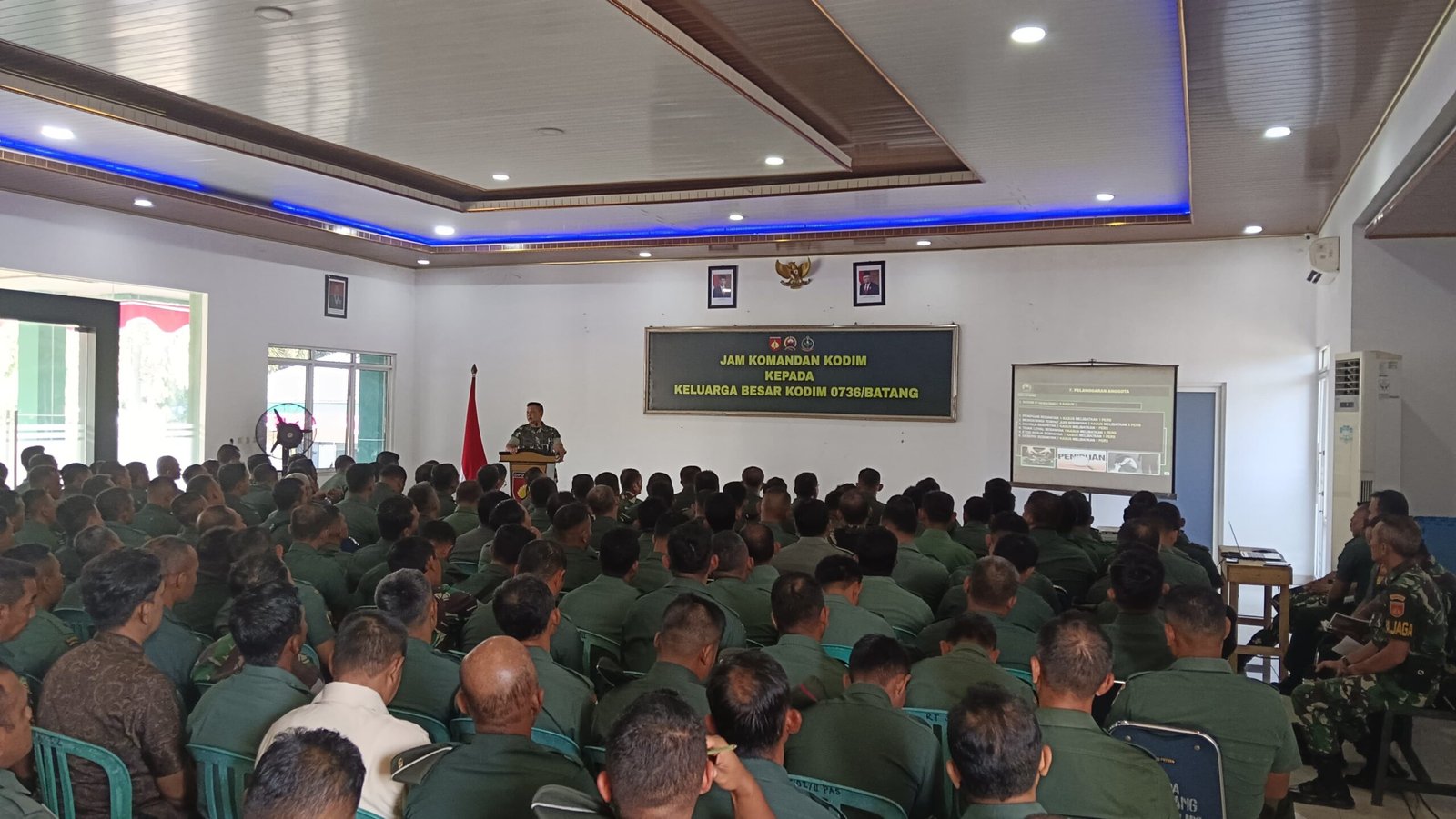 Batang,- Kodim 0736/Batang mengelar Jam Komandan yang diambil langsung Dandim Letkol Inf Ahmad Alam Budiman dan diikuti oleh prajurit militer dan PNS jajaran, bertempat di Aula Makodim Jln. Jenderal Sudirman No. 41 Kelurahan Kasepuhan Batang, Rabu (18/09/2024).