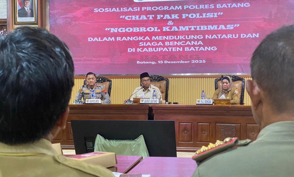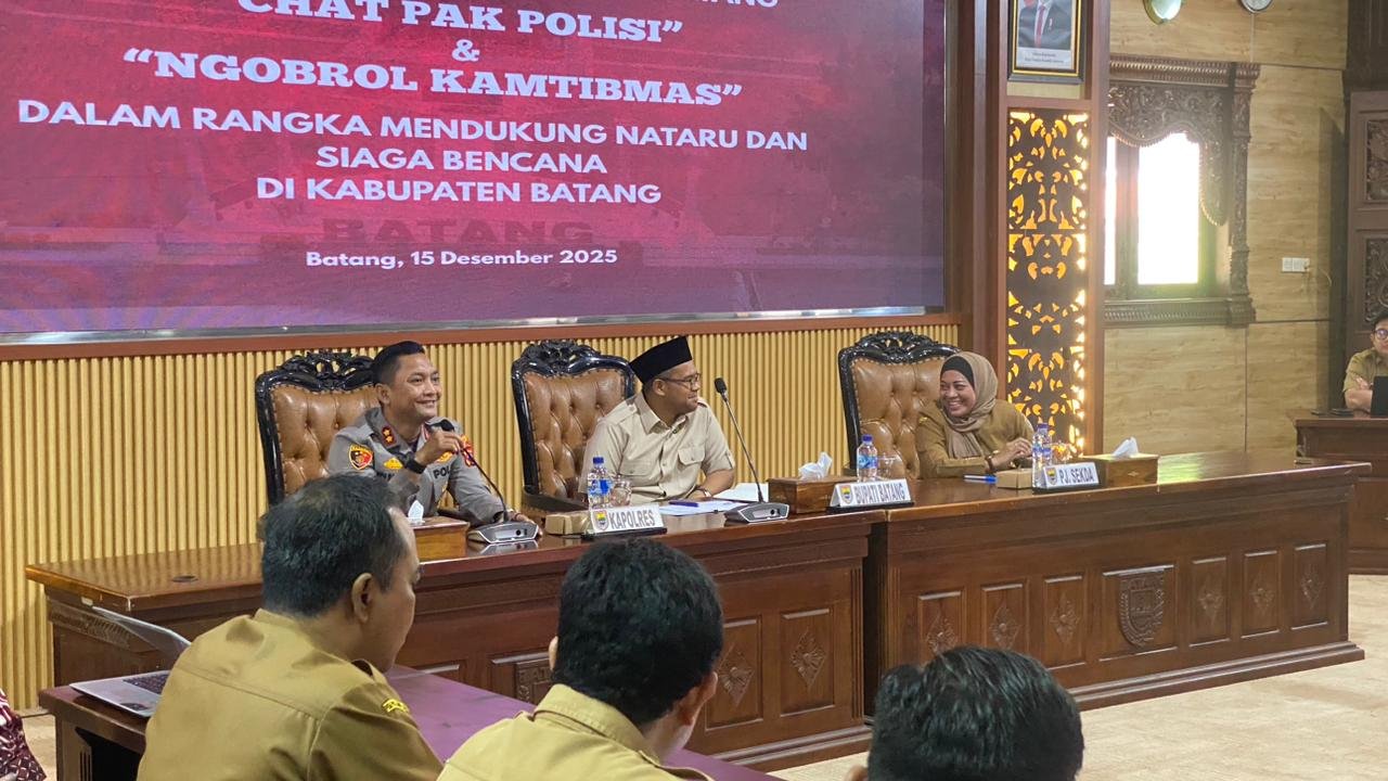 Batang – teraspanturanews.com Menjelang perayaan Natal 2025 dan Tahun Baru 2026 (Nataru), Polres Batang meluncurkan inovasi layanan berbasis teknologi bertajuk Chat Pak Polisi dan Ngobrol Kamtibmas. Program ini diperkenalkan dalam kegiatan sosialisasi yang digelar di Aula Bupati Batang, Kabupaten Batang, Senin (15/12/2025).