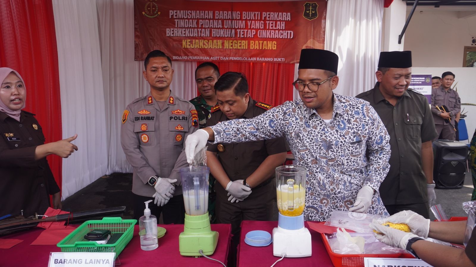 Keterangan Foto : Bupati Batang M. Faiz Kurniawan (baju batik), musnahkan barang bukti tindak pidana, di halaman belakang Kejari Batang, Kabupaten Batang.