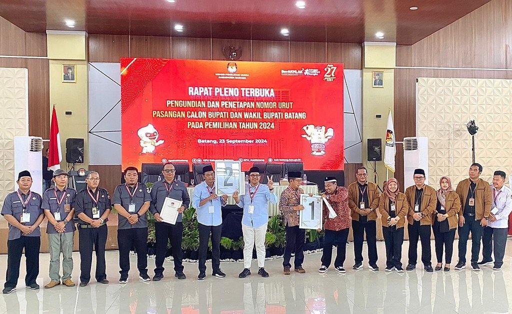Batang – Komisi Pemilihan Umum (KPU) Kabupaten Batang melakukan pengundian nomor urut pasangan calon (paslon) Bupati dan Wakil Bupati Pilkada 2024. Hasilnya, pasangan Fauzi Fallas-Ahmad Ridwan nomor urut 1 dan pasangan Faiz Kurniawan-Suyono nomor urut 2.