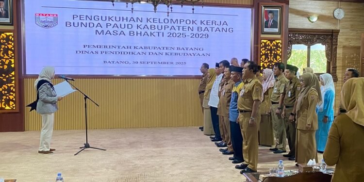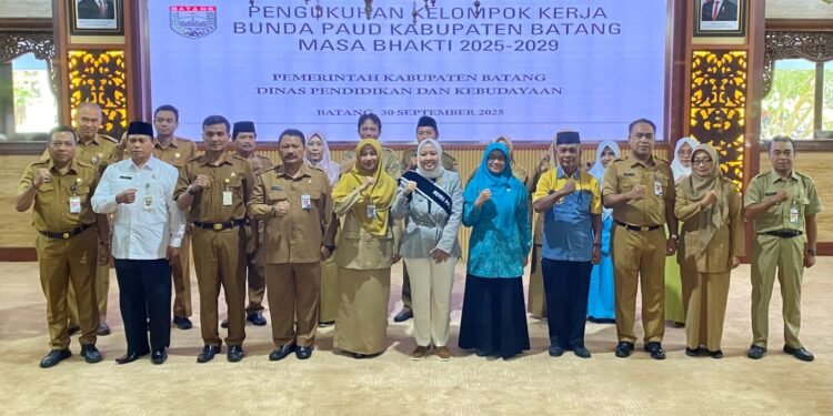 Batang – teraspanturanews.com Ketua Bunda PAUD Batang Faelasufa Faiz Kurniawan, resmi mengukuhkan Kelompok Kerja (Pokja) Bunda PAUD Batang di Aula Bupati Batang, Kabupaten Batang, Selasa (30/9/2025). Acara ini dirangkai dengan pelatihan guru PAUD bersama narasumber dari Jakarta yang pernah mengajar di sekolah-sekolah terbaik, termasuk anak tokoh nasional.
