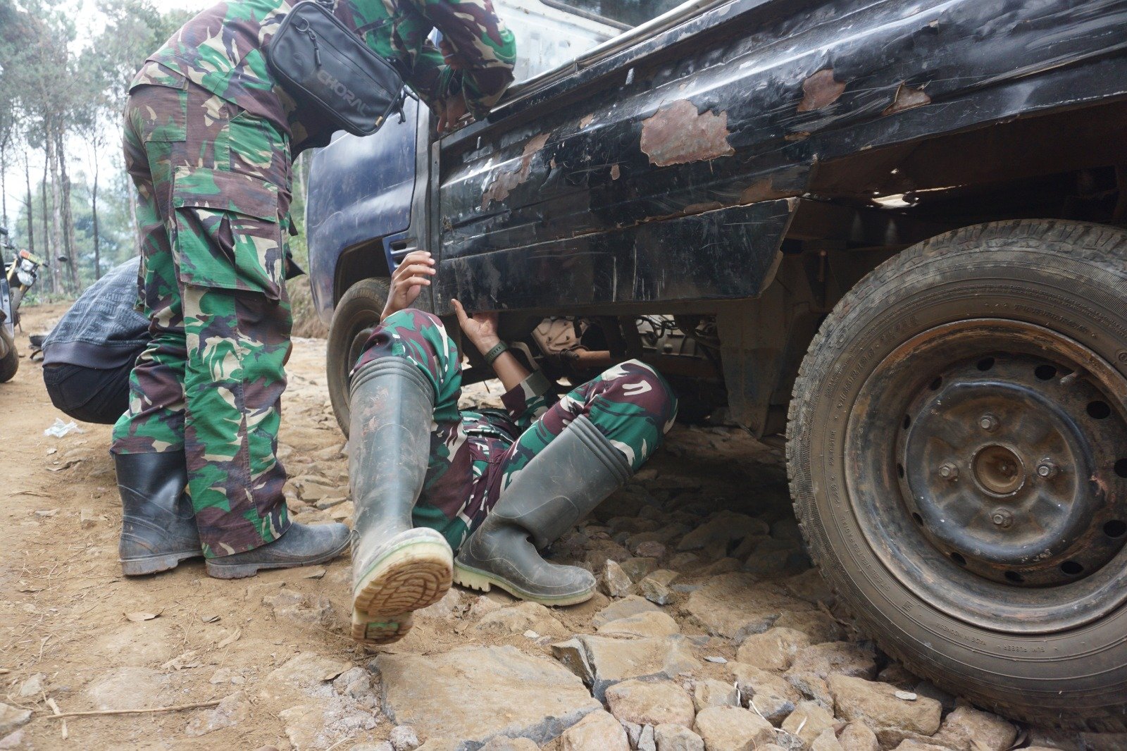 Melihat kondisi mobil yang rusak, salah satu personil dari Satgas TMMD Reguler ke 121, Serka Fajar turut membantu memperbaiki. “Sudah menjadi tugas dan tanggung jawab bersama kalau ada kendala dalam proses pengerjaan program TMMD, Kami semua akan berusaha memperbaiki mobil yang rusak agar progres TMMD dapat berjalan dengan lancar dan selesai sesuai dengan batas waktu yang telah ditentukan” ucap Sersan Fajar.