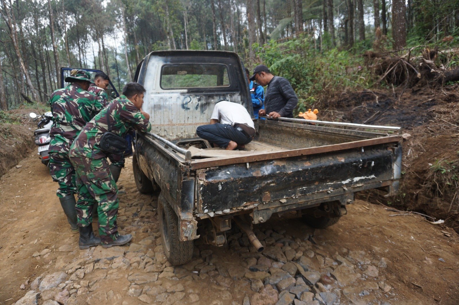 Batang,- Kendaraan picup sangat membantu dalam pengangkutan material dilokasi TMMD Reguler Ke 121 Kodim 0736/Batang, namun tadi siang mobil tiba – tiba mengalami kerusakan dan tidak bisa berjalan. Terlihat beberapa personil Satgas ikut memperbaiki mobil pengangkut material yang mengalami kerusakan saat mengedrop material batu dilokasi TMMD di Desa Pacet Kecamatan Reban, Kabupaten Batang. Rabu (14/08/24).