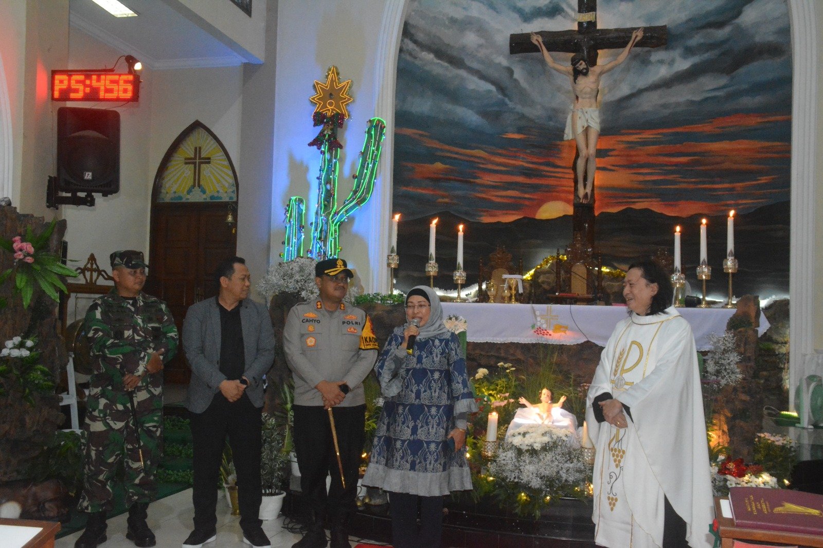 Kunjungan ini dipimpin oleh Penjabat Bupati Batang Lani Dwi Rejeki, bersama Dandim 0736/Batang Letkol Inf Ahmad Alam Budiman dan Kapolres Batang AKBP Nur Cahyo Ari Prasetyo menyambangi beberapa gereja di Kabupaten Batang yang sedang melaksanakan ibadah Misa Malam Natal, Selasa (24/12/24).