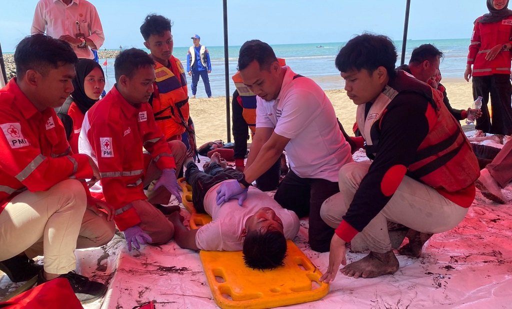 Batang – Dalam rangka memperingati Hari Ulang Tahun (HUT) Palang Merah Indonesia (PMI) Ke-79, PMI Kabupaten Batang melalui Korp Sukarela (KRS) PMI Batang simulasikan penyelamatan di laut.