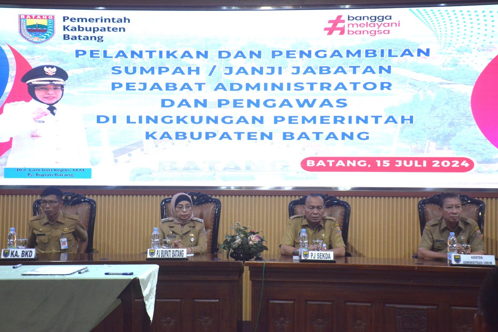 Pj Bupati Batang Lani Dwi Rejeki mengatakan, sebanyak 89 orang yang dilantik terdiri dari Administrator 41 orang dan Pengawas 48 orang. Pelantikan dan pengambilan sumpah/janji ini merupakan sebuah amanah dan kepercayaan yang diberikan oleh negara kepada saudara-saudara untuk melaksanakan tugas dan tanggung jawab dalam jabatan yang baru.