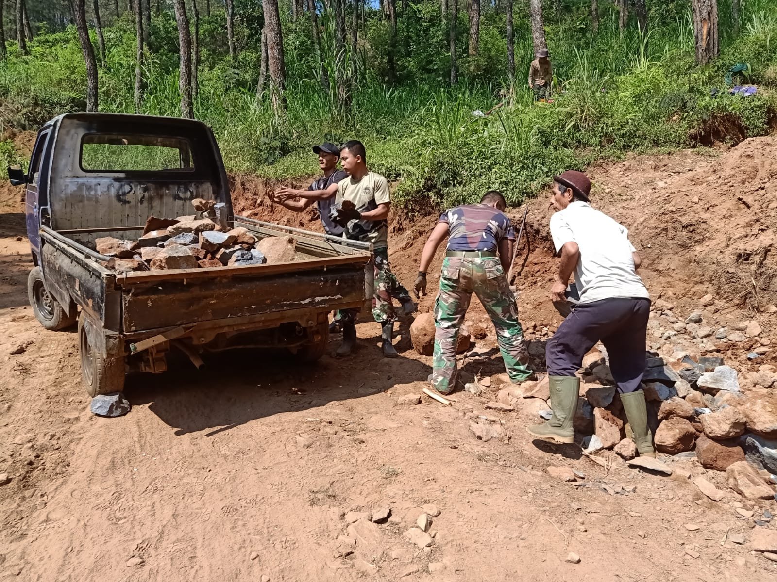 Batang,- Dalam rangka Kebut sasaran fisik jalan makadam yang menghubungkan dua desa dan dua Kecamatan yaitu desa Pacet Kecamatan Reban dan desa Gerlang Kecamatan Blado, para Satgas TNI Manunggal Membangun Desa (TMMD) Reguler 121 Kodim 0736/Batang menggunakan kendaraan bak terbuka (pick-up) untuk melangsir batu ke lokasi bersama masyarakat.