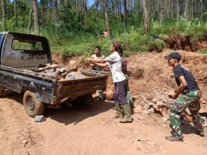 Satgas TMMD Bersama Warga Angkut Batu Material Gunakan Kendaraan Pick-up
