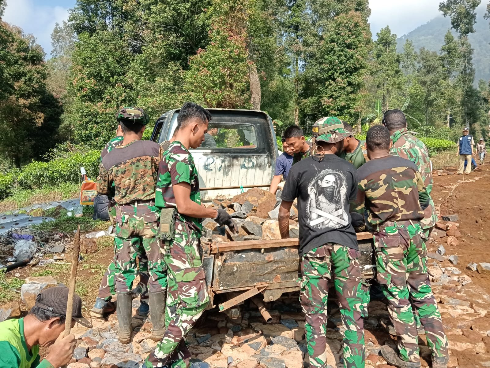 Tampak terlihat beberapa anggota satgas TMMD saling bahu membahu dan bersemangat, Itulah moment kebersamaan yang hangat antara TNI dan rakyat, mereka bekerja bareng saat mengangkat batu untuk di masukan dalam mobil pickup.