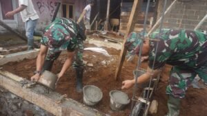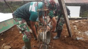 Terlihat Satgas bersama warga berjibaku mengecor dasar pondasi agar bangunan itu lebih kokoh serta hasil bangunannya bisa maksimal.