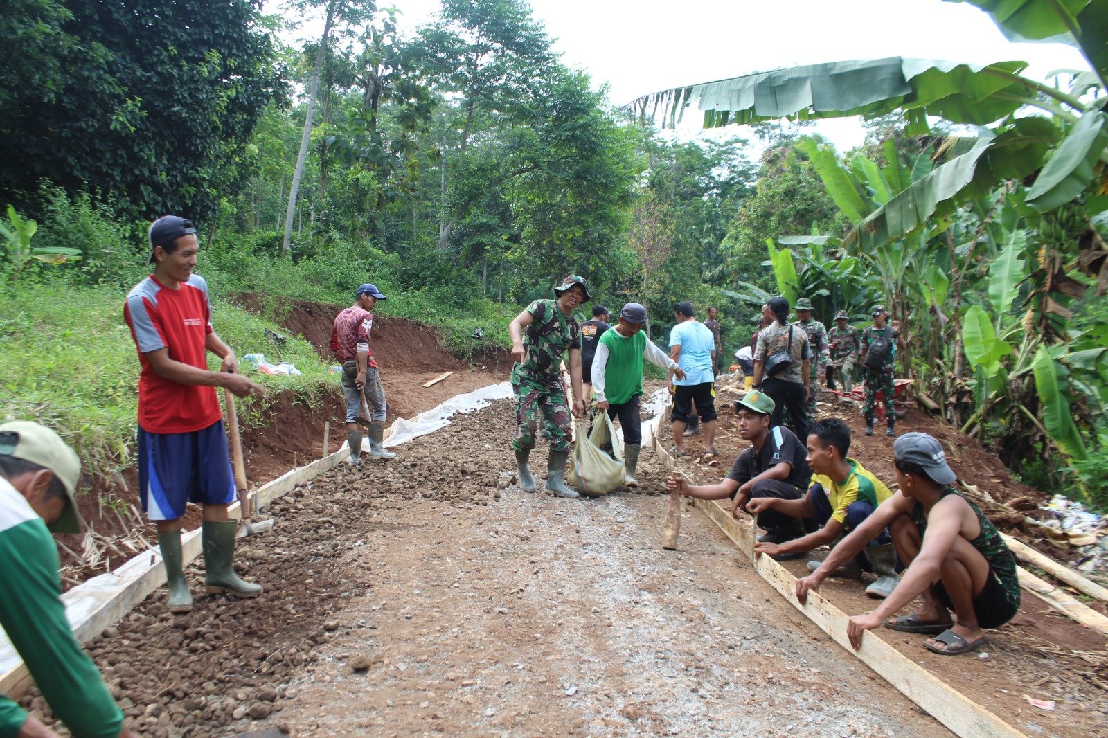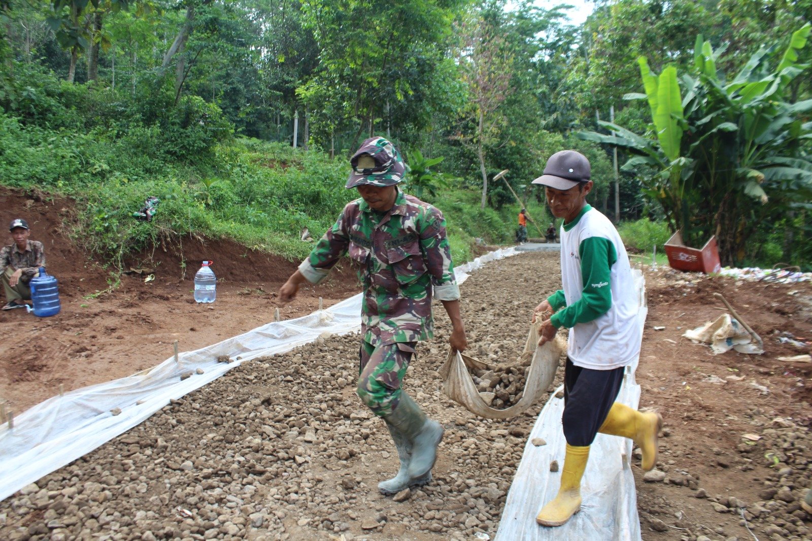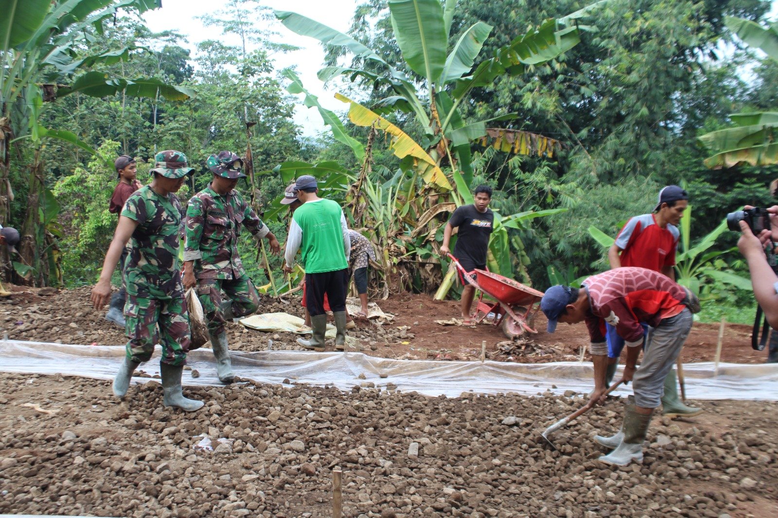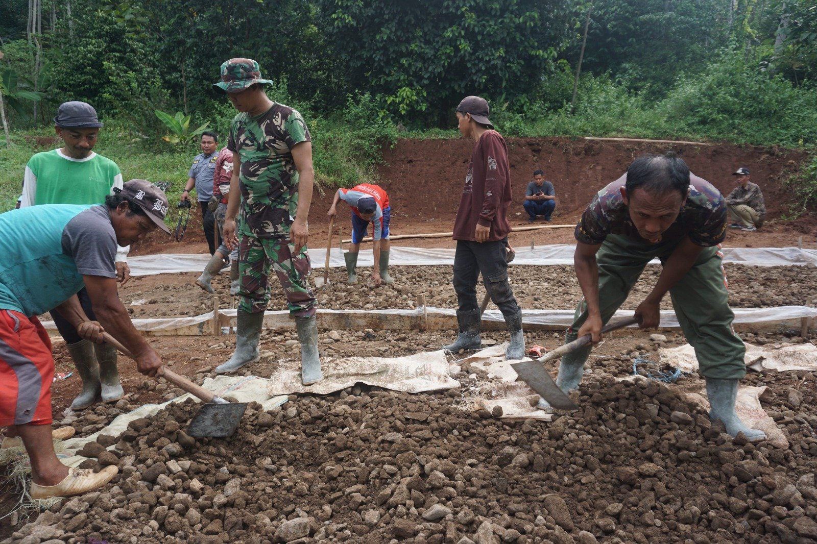Dengan menggunakan peralatan manual sepeti cangkul, sekop, arco dan karung, mereka memastikan dasar jalan rata dan kuat sebelum dilakukan pengecoran rabat beton.