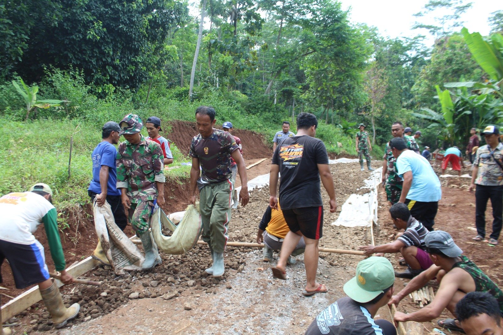 Untuk efektifitas waktu dan tenaga personel dibagi dalam beberapa kelompok, ada yang melangsir material, pemasanagan begisting dan menggelar Sirtu untuk dasaran. Pengadukan material dengan menggunakan molen untuk pengecoran juga harus jalan agar semua dapat berjalan dengan cepat dan lancar, “tambahnya”.