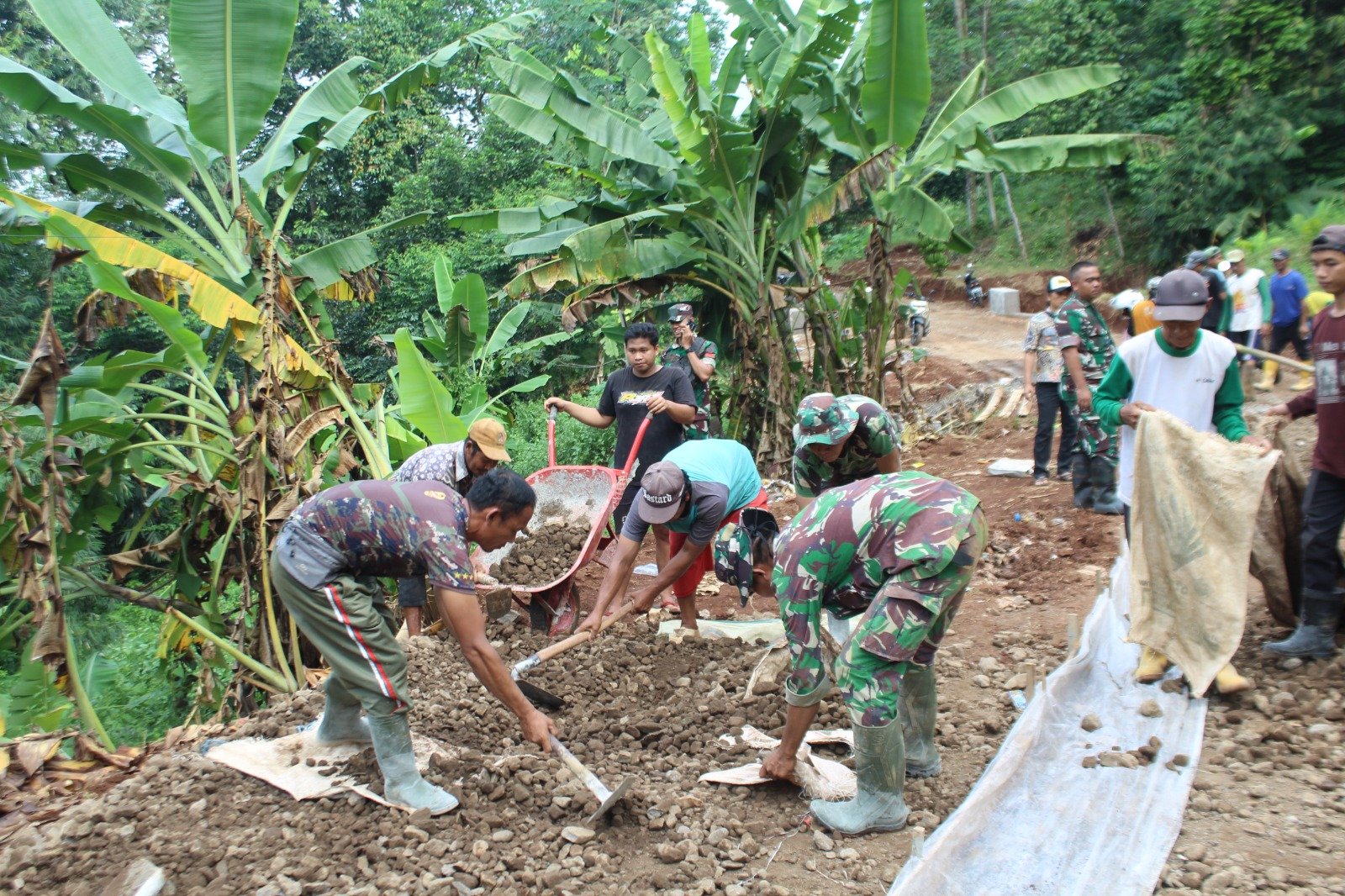 Batang,- teraspanturanews.com Semangat kebersamaan antara TNI dan warga menjadi kunci sukses pengecoran jalan yang merupakan salah satu sasaran utama dalam progres TMMD Sengkuyung Tahap II Kodim 0736/Batang, Korem 071/Wijaya Kusuma. Diantaranya saat proses penyebaran sirtu (campuran pasir dan batu) untuk dasaran jalan. Tampak terlihat hari ini Jum’at (23/05/2025), personel satgas dan masyarakat setempat dengan bahu membahu bekerja meratakan material pecahan batu dan pasir.