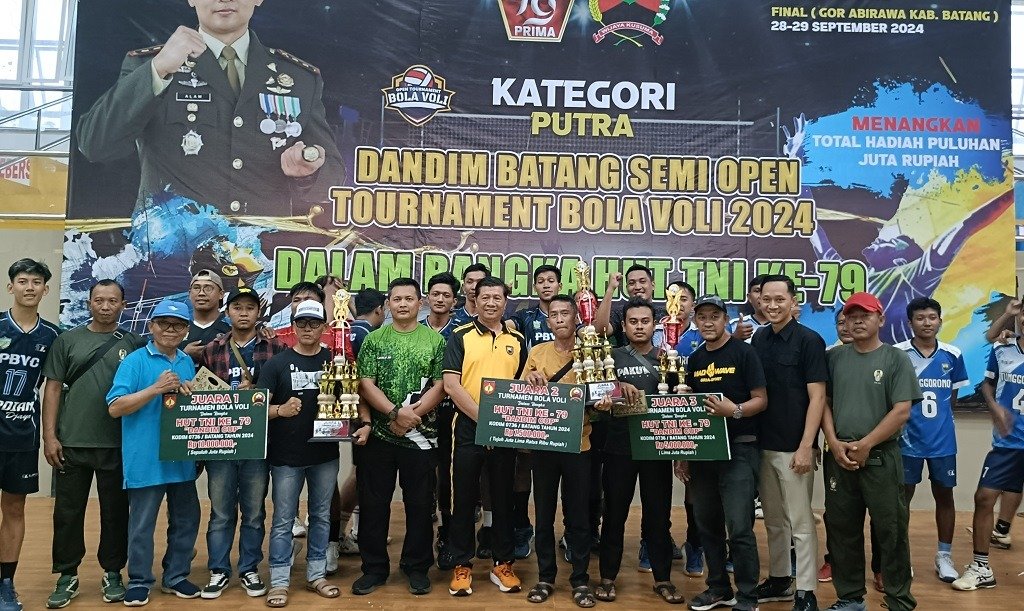 Batang – Usai beberapa pekan digelar, akhirnya Kodim 0736/Batang mengumumkan tiga pemenang ajang Turnamen Bola Voli Semi Open Dandim Cup, untuk memeriahkan HUT Ke-79 TNI. Juara pertama diraih Desa Sembung Banyuputih, Juara 2 Desa Sidorejo Gringsing dan Juara 3 Desa Pucanggading Bandar.