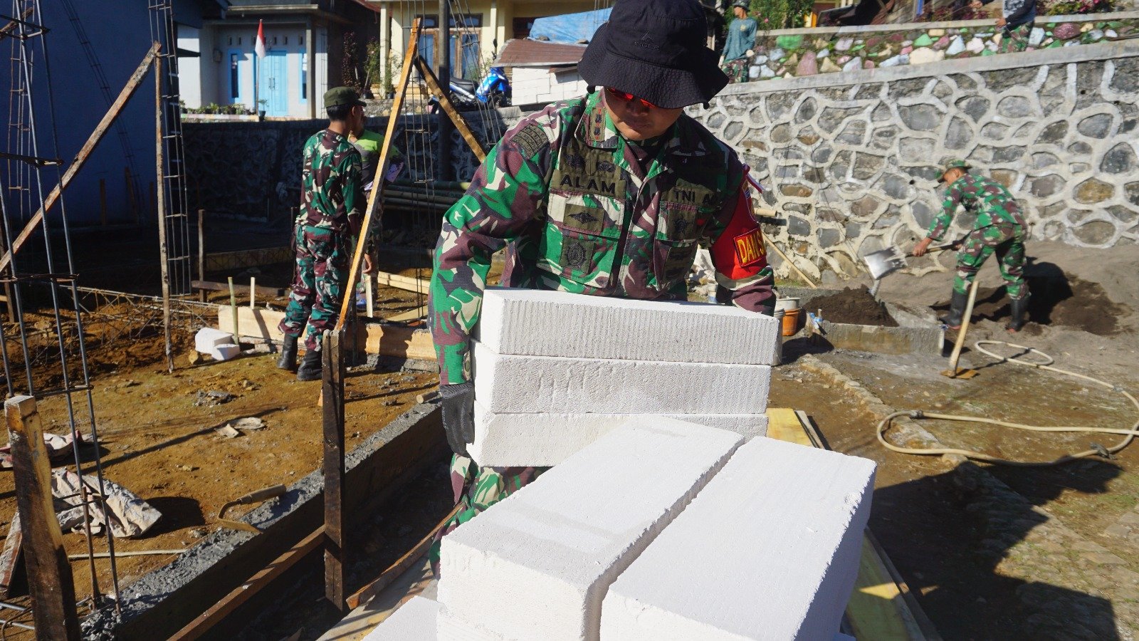 Seperti halnya, yang dilakukan dalam penyiapan material yang akan digunakan untuk pembangunan RLTH, Letkol Alam dengan tidak memperdulikan jenis pekerjaan, ikut membantu warga dan Satgas dalam mengangkat herbel dan menyusunnya.