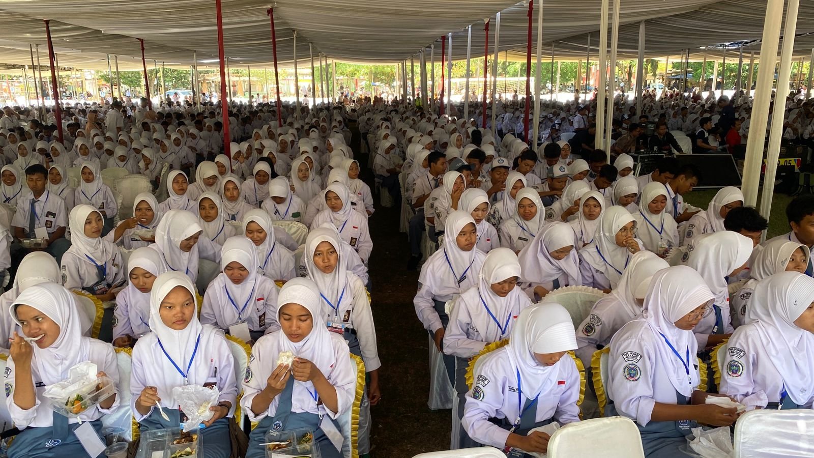 Batang – Dalam upaya mendukung program pemerintah pusat, sebanyak 3.000 pelajar mengikuti program makan bergizi gratis di Lapangan Dracik, Kecamatan Batang, Kabupaten Batang, Rabu (18/9/2024).