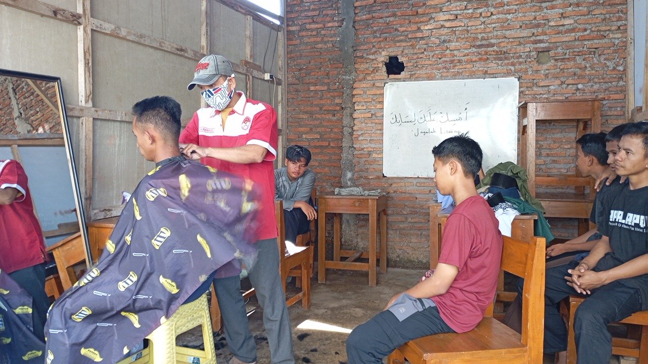 Memasuki sesi kedua pada siang hingga sore hari, tim melanjutkan kegiatan dengan bersambang ke Pesantren Selamat Cahaya Qur’an Kabupaten Batang. Sebanyak 27 santri putra mendapatkan layanan pangkas rambut gratis dengan penuh antusiasme.
